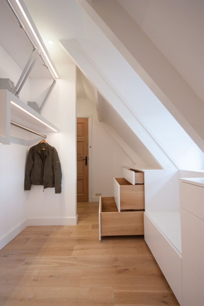 Bij kasten onder schuine daken of in lastige nissen bieden we een breed scala aan ontwerpmogelijkheden. Kies tussen draaideuren en open vakken, die we leveren in diverse kleuren en materialen, afgestemd op jouw persoonlijke smaak. Het interieur van de kast wordt zorgvuldig samengesteld op basis van jouw specifieke behoeften. Of je nu hanggedeelten voor jurken en pakken, legplanken of lades verkiest, wij passen de kast aan volgens jouw voorkeuren.